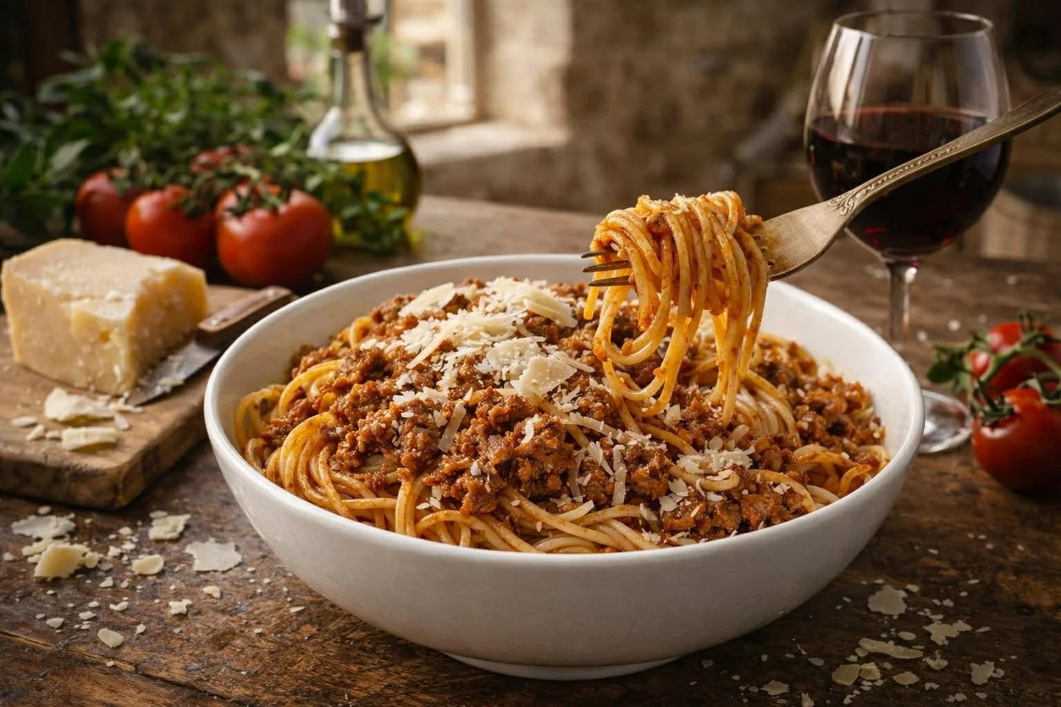 Send it to the table, with boiled spaghetti or boiled tagliatelle, and a bowl of grated Parmigiano-Reggiano.